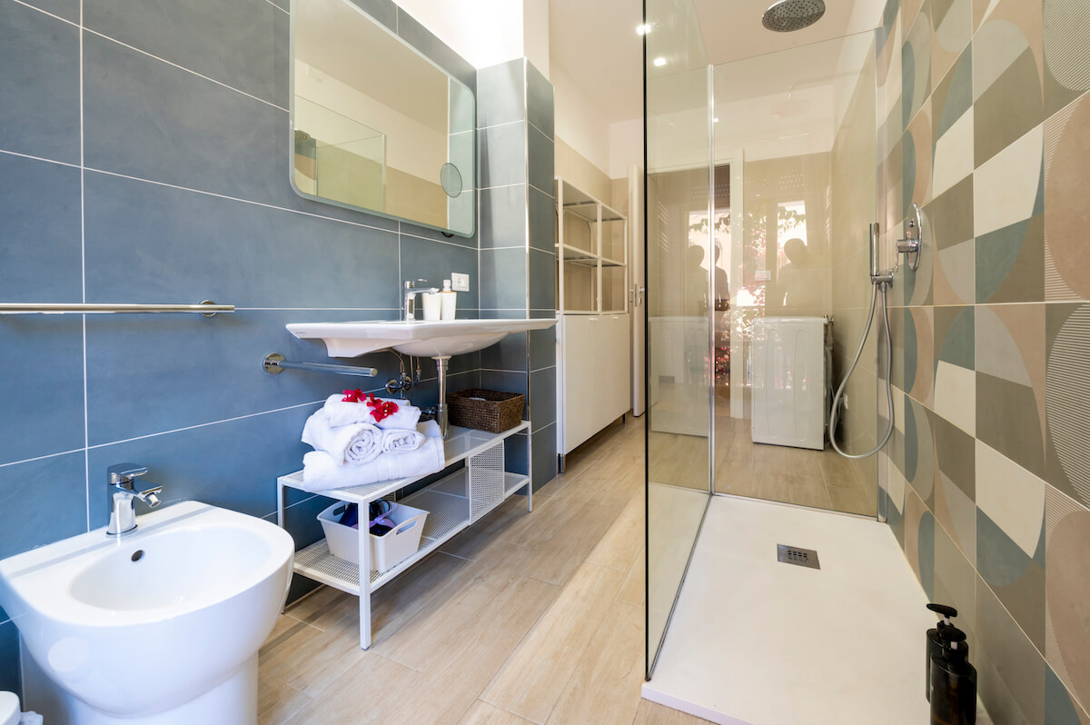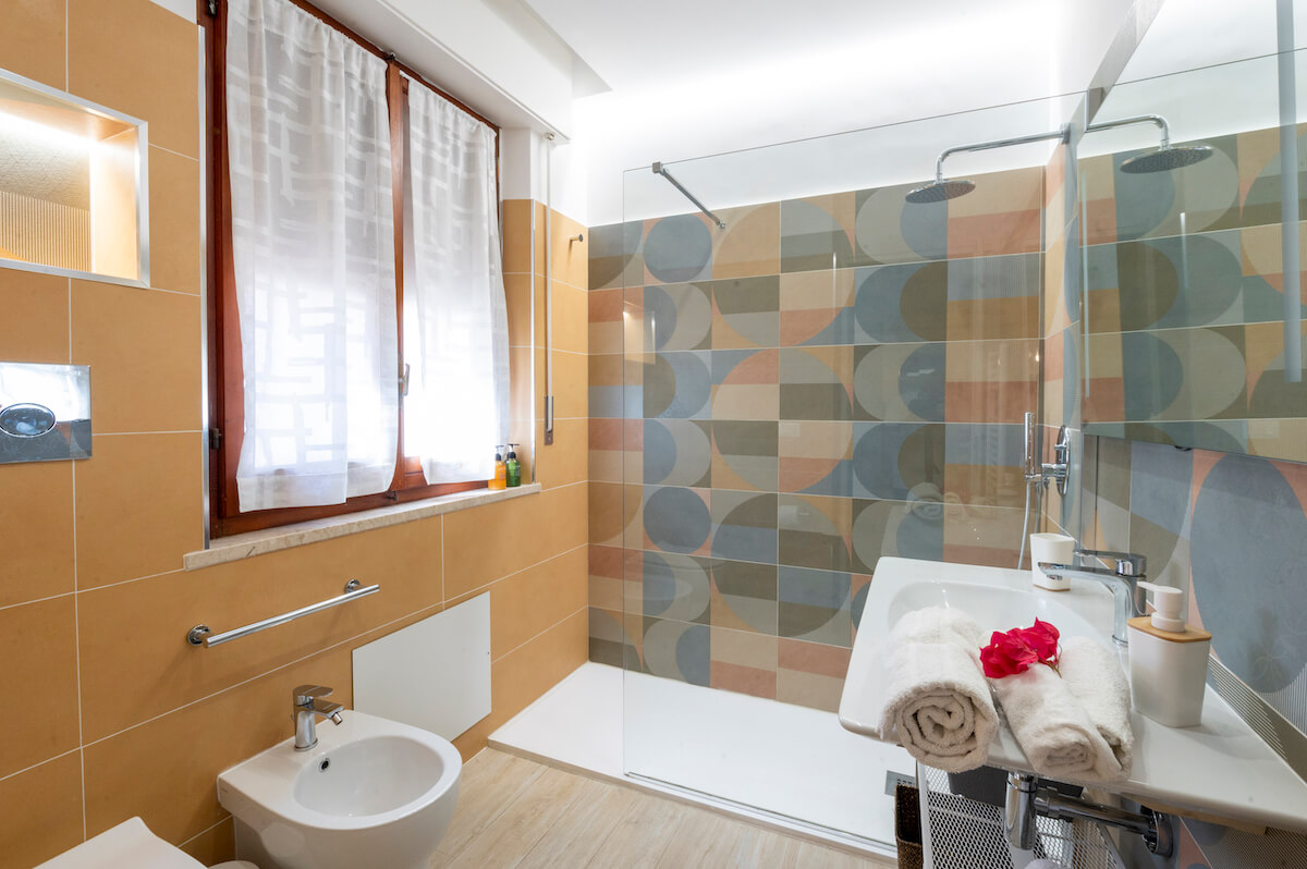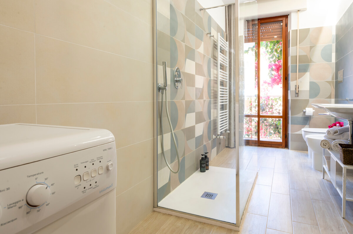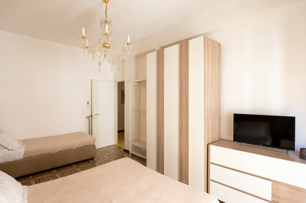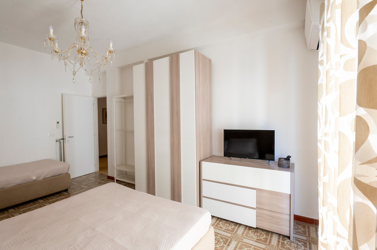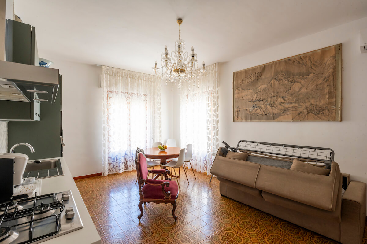 Questo appartamento dispone di 2 camere da letto con letto matrimoniale, un soggiorno-cucina con divano letto, i 2 bagni sono dotati di doccia, wc, bidet, lavabo.